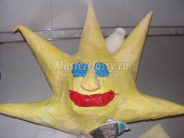 Сушат поделку либо в духовке при температуре 30-40 С, либо просто на столе, но не на батарее, иначе тесто растрескается. После высыхания солнышка его раскрашивают краской (гуашью или акрилом) и покрывают лаком или клеем с блестками.