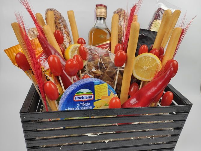 Предлагаем вам взять колбаски из дичи (можно взять салями) и вяленую горбушу. А чтобы разнообразить презент и внести в него необычную нотку, нужно добавить копченый сыр (косичку) и красный свежий перец. А центром «притяжения» колбасного букета станет бутылка пива, можно взять виски Jack Daniel’s или вино. Последнее будет особенно вкусным, ведь вино и сыр — идеальный дуэт.