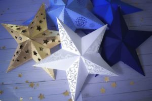 Для моделей можно использовать цветную бумагу или фольгу. Сложные трафареты звезды для вырезания из бумаги, шаблоны ажурной формы вырезать следует очень аккуратно. Здесь подойдут небольшие ножницы с острыми концами.