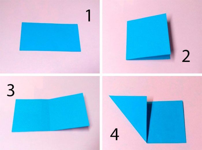 - Складываем верхний угол к центру. Повторяем действие с правым углом. Левый угол тянем книзу, а правый до точки прикосновения с центром полоски. Повторяем действия.