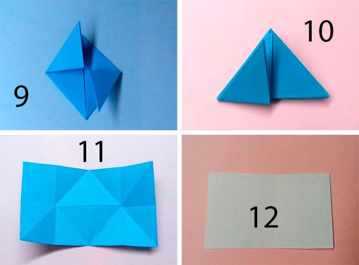 - Свернуть получившиеся треугольники пополам — левый вверх, правый вниз.