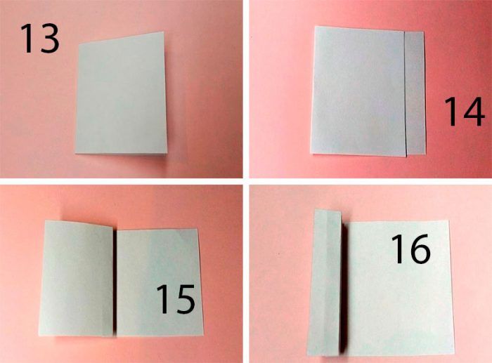 - Получившиеся в результате складывания на предыдущем этапе прямоугольники согнуть пополам. Делать это нужно внутрь, чтобы верхняя и нижняя части соединились.