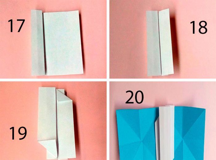 - Сложить синюю деталь по линиям сгиба, частично заведя под отогнутые уголки на белой, дальше сложить по всем остальным сгибам.