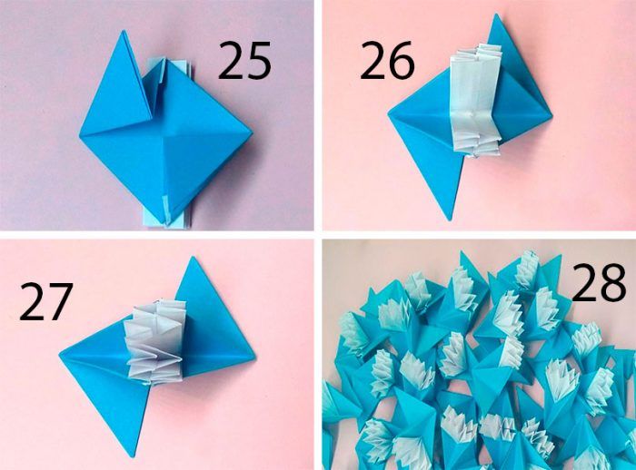 Собрать 30 двухцветных элементов. Намазать клеем кармашек на синей части около белой гармошки. Вложить следующую деталь, приклеить. Таким образом склеить 5 деталей, получится модуль. Из модулей собрать шар, склеивая по боковым сторонам.