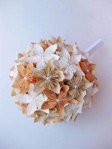 - Третий вариант — модульный цветок. Эта фигура из трех вариантов наиболее сложная, так как в ее изготовлении участвуют от 60 модулей. Сами модули так же не совсем просты в сборке. Каждая отдельная деталь представляет собой отдельный небольшой цветок с 6 лепестками. Обычно создается 10 таких цветов, а сам шар напоминает на вид цветочный топиарий.