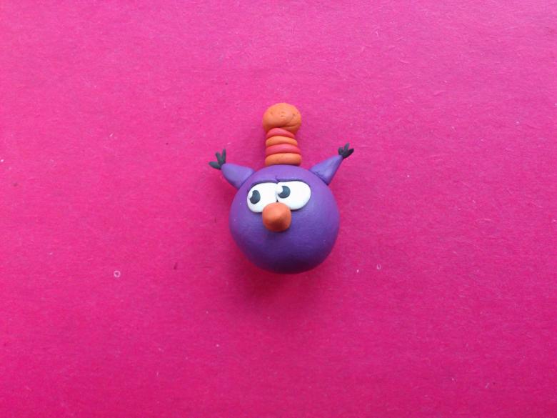 Из розового и красного пластилина слепите мордочку, а белый пластилин используйте для зубов и глазок. Голубой пластилин – брови и веки, а черный – зрачки. Оформите все детали на голове.