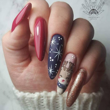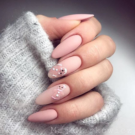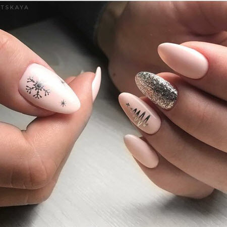 Миндаль всегда остается популярен среди девушек, так как это удобный и универсальный маникюр, на который красиво ложится любой дизайн. Обтекаемая форма ногтевой пластины придает небольшое удлинение. Для дизайна лучше всего подойдет техника нейл-арт с украшением маникюра в виде рисунков, стразов и наклеек в новогоднем стиле.