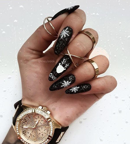Удлиненная форма подходит для всевозможных экспериментов с дизайном и цветовой палитрой для нескольких цветов. На длинных ногтях будет стильно выглядеть новогодний стиль: вязанный дизайн, втирки, стразы, блестки, нарисованные елочные игрушки, гирлянды, елки, снеговики, олени, дед мороз. Также стоит попробовать необычное сочетание матового покрытия с выделением глянцевого декора.