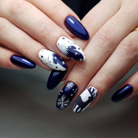 Даже на небольшой длине ногтевой пластины получится создать оригинальную зимнюю композицию или рисунок. При этом форма ногтя может быть как квадратной, так и овальной. Маленькие елочки и подарки, снежинки и звездочки или даже олени и снеговики на ногтях актуальны этой зимой.