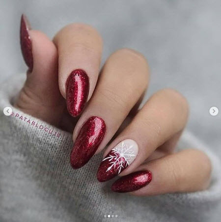 Для любительниц более глубоких тонов красного, прекрасным Новогодним вариантом будет сочетание бордового цвета с серебряными блестками или стразами. Также, можно добавить к этому дизайну белый и серый цвета. Например, можно нарисовать белые снежинки на бордовом фоне, а один или пару ноготков выделить серым цветом и добавить немного серебристых блесток.