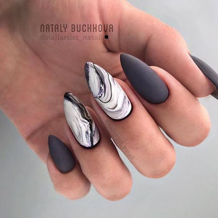 Мраморный дизайн ногтей очень элегантно смотрится в зимние дни сезона 2021-2022, особенно если выбирать холодные оттенки лаков. Мраморные мотивы, повторяющие орнамент натурального камня, так полюбились женщинам во всем мире, что это один из самых модных дизайнов ногтей последних лет.