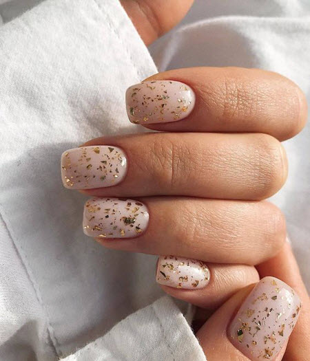 Если ты любишь лаконичную классику на коротких ногтях – смело выбирай полупрозрачный нюд. Он в тренде весь этот год, и останется с нами в 2022. А для праздничной новогодней атмосферы добавь немного блесток.