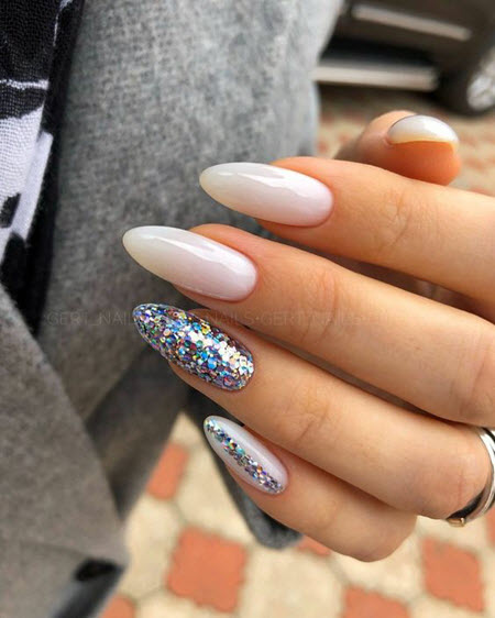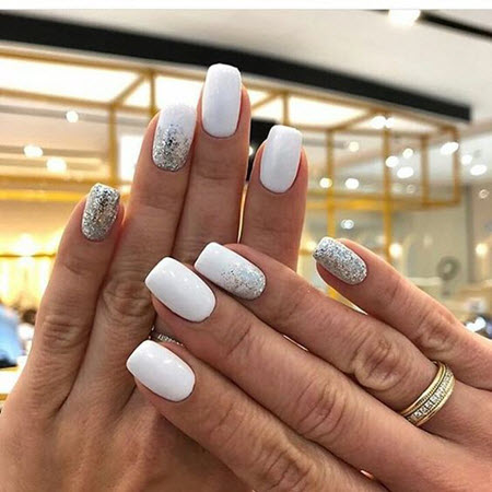 Белый цвет универсален. Подходит к любому образу и любой цветовой гамме. Оживить белый фон можно при помощи блесток. Достаточно декорировать один-два ноготка, и маникюр станет более живым и нарядным.