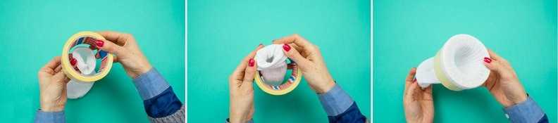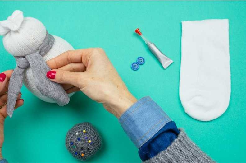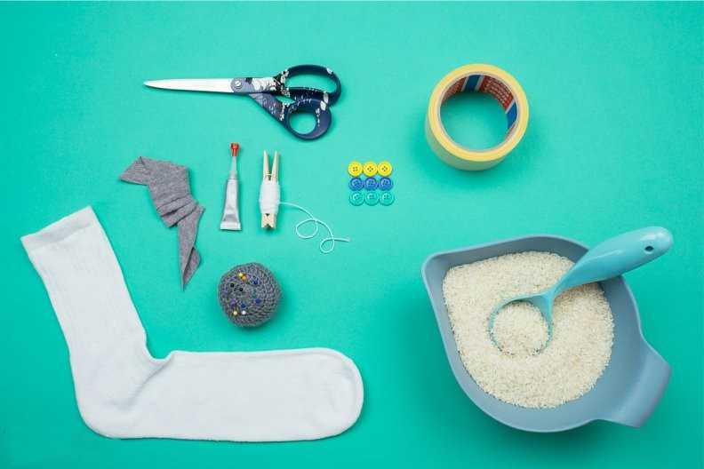 - Наполнить рисом верхнюю часть и перевязать макушку (резинка носка) — это голова.