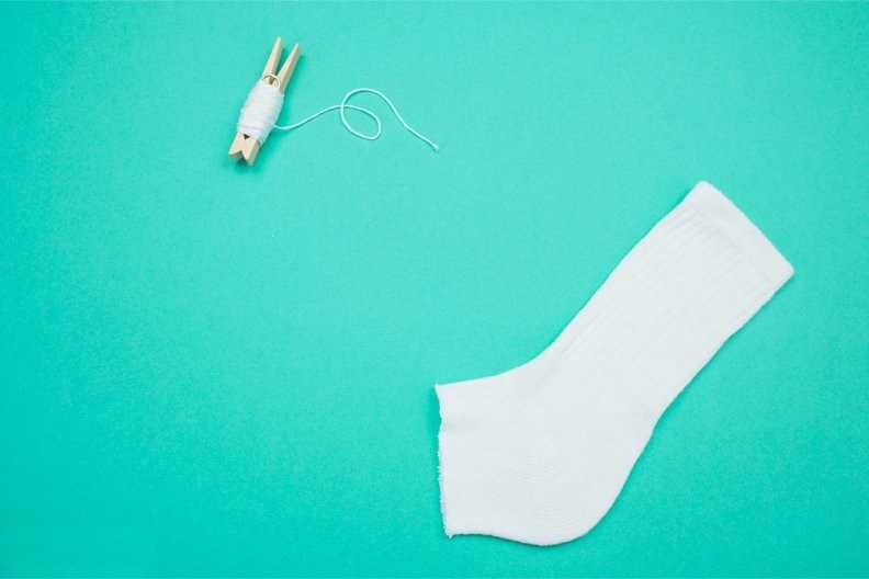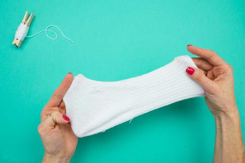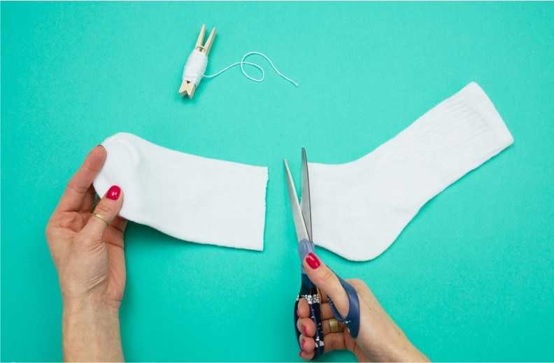 - Отрезать у носка нижнюю часть выше пятки, чтобы получился рукав-труба. Отрезанную часть пока отложить в сторону.