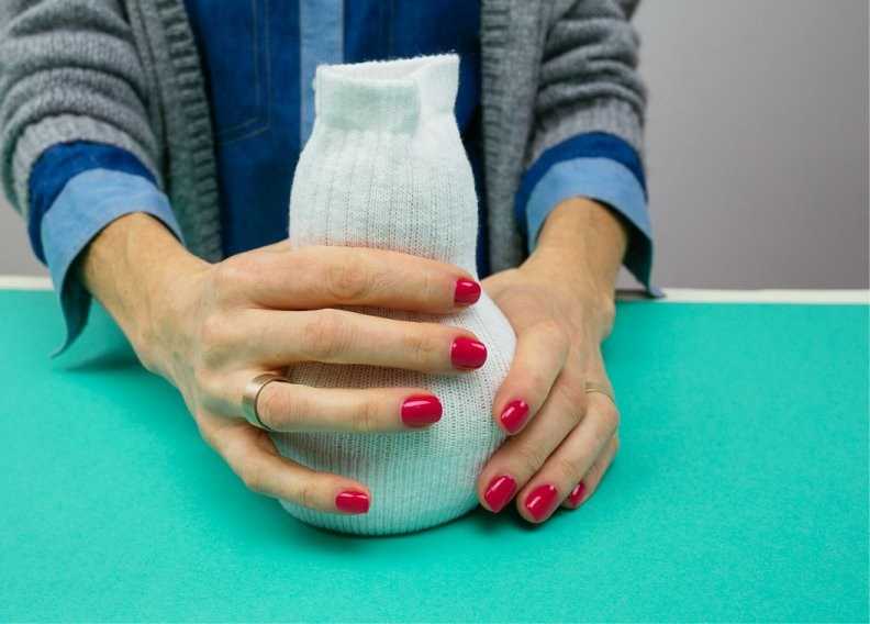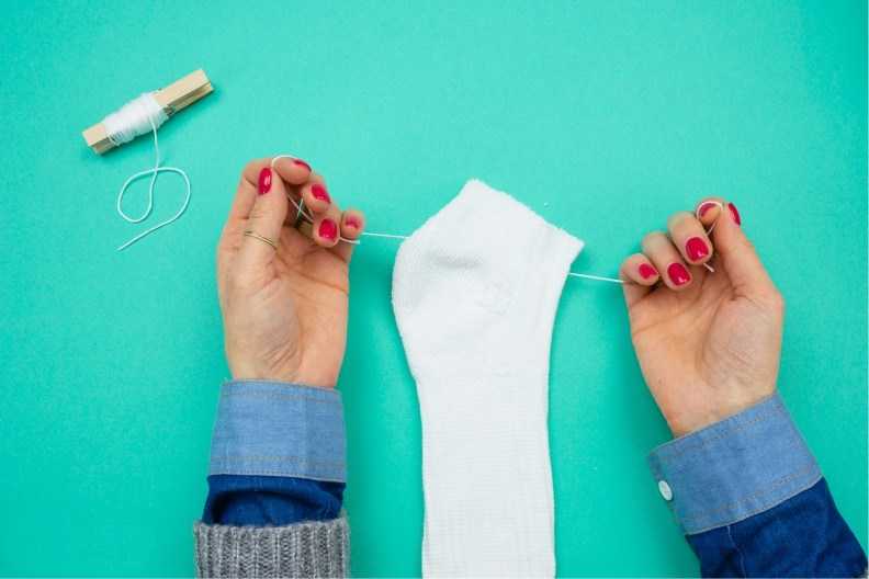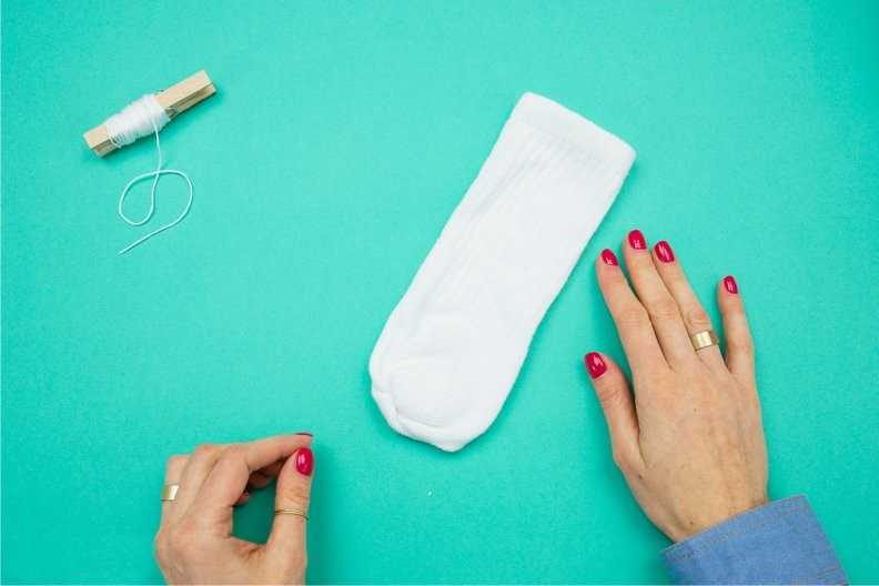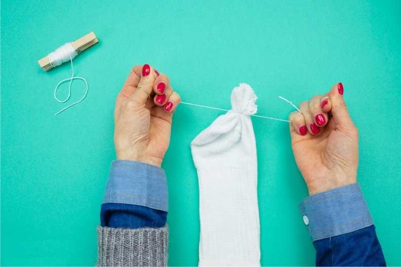 - Заполнить носок рисом чуть больше, чем наполовину и перевязать ниткой в несколько оборотов — это тело снеговика.
