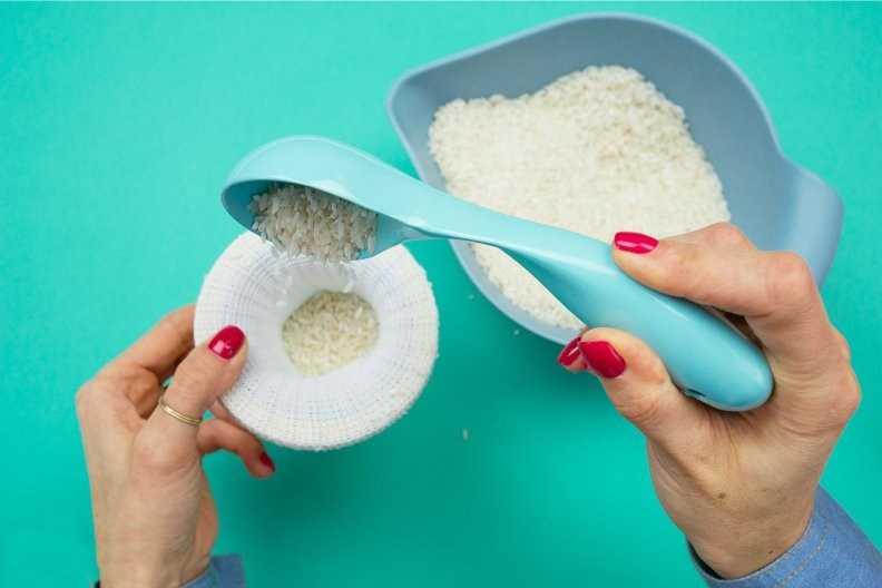 - Насыпьте часть риса в носок в таком количестве, чтобы вас устроил размер нижнего шара снеговика, сформируйте его, помяв руками.