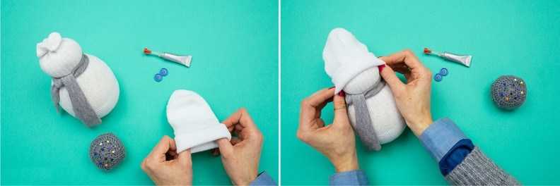- Обрезанную часть носка отвернуть в месте отреза и надеть на голову, чтобы получился длинный колпак. Можно шапку снеговику не делать, а завязать на макушке красный бант — будет милая девочка-снеговичок.
