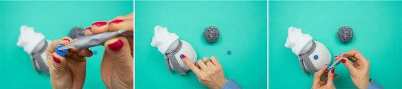 Вырезаем из фетра детали носа и рта, приклеиваем их и глаза на тело снеговичка.