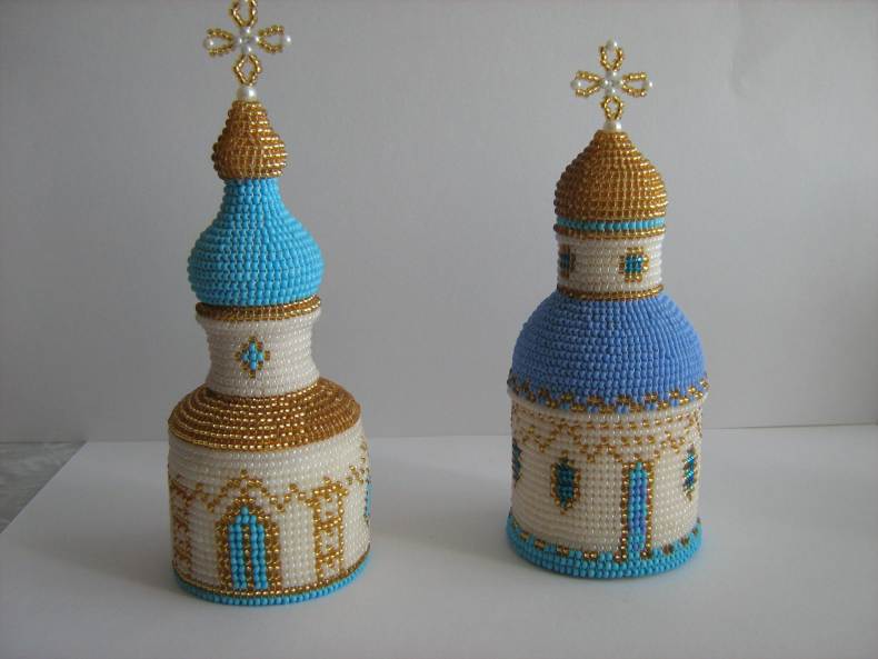 Например, набираем на проволоку 10 бусин, пропускаем проволоку сквозь бусины еще раз, но над каждой бусиной добавляем по 3 бисеринки и так плетем далее до нужной высоты, в последних рядах убавляем количество бусин и смыкаем макушку колокола.