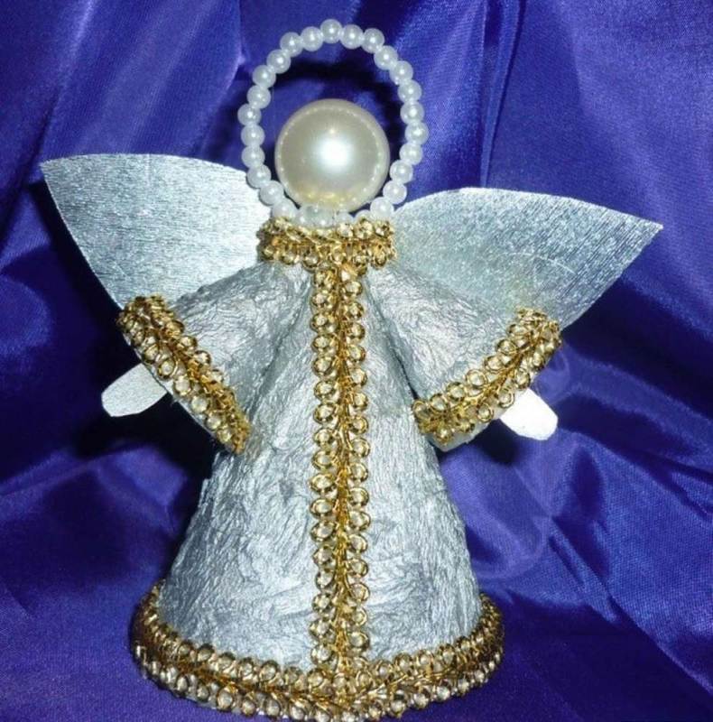 - Теперь приклеиваем маленькие конусы к большому, это будут рукава. И также приклеиваем голову. Вместо нимба ангелочку можно сделать что-то вроде диадемы из жемчужной нити.