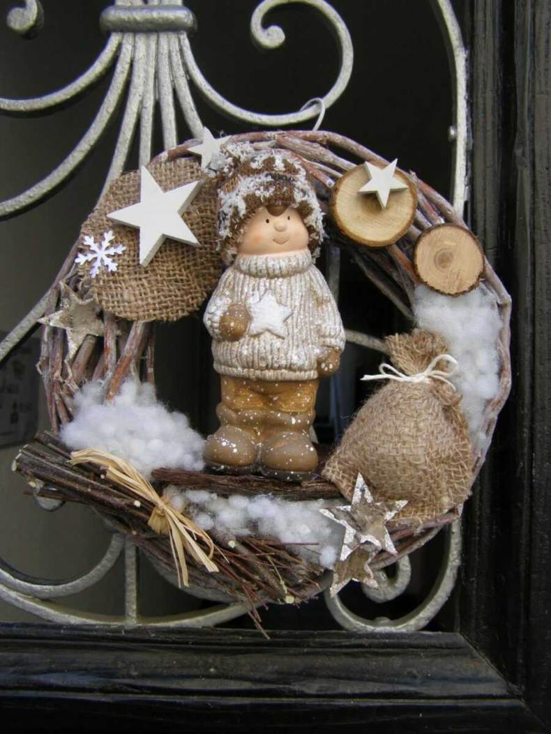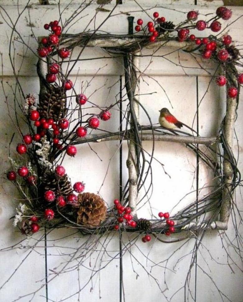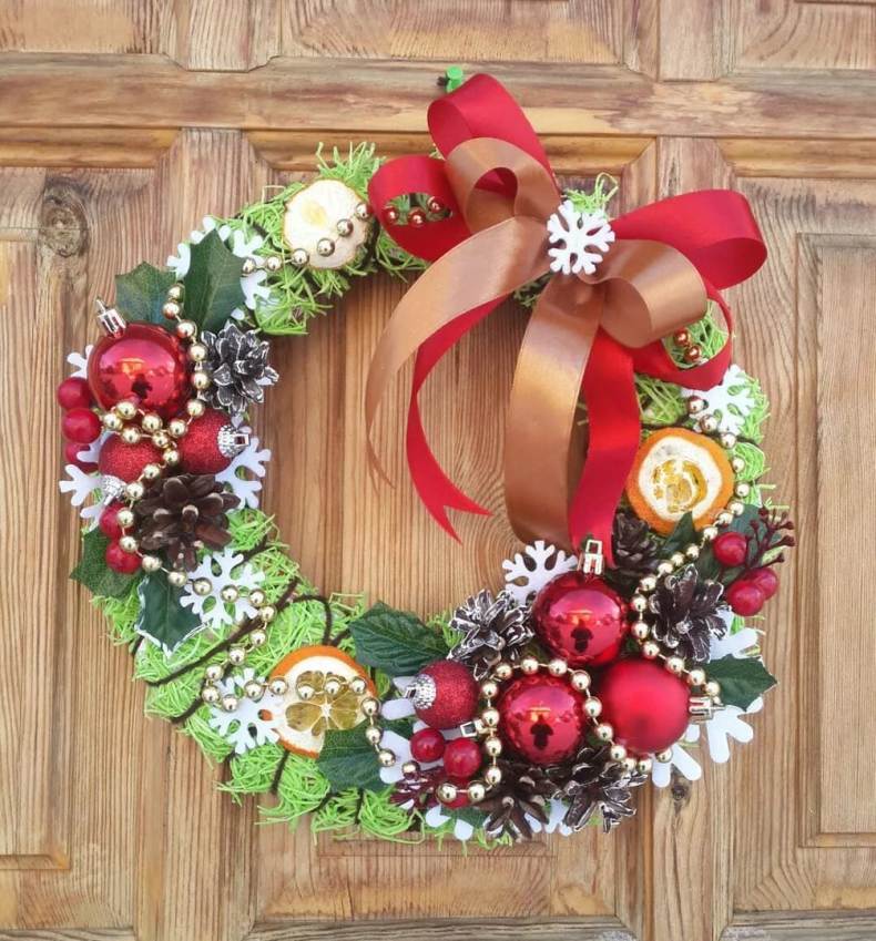 Великолепно выглядят традиционные венки, размещенные на входной двери. Для их изготовления вам понадобится жесткий каркас, который можно изготовить из картона, проволоки или пенопласта.