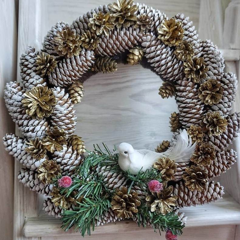 В качестве декора отлично подойдут шишки, веточки рябины, елочные игрушки или хвойные веточки. Дополнительно декор можно окрасить шишки и веточки блестящей краской, что придаст венку особую роскошь.