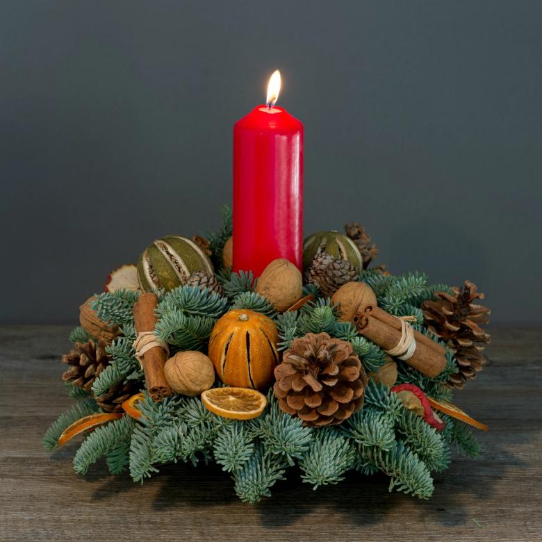 Традиционно к Рождеству свечами свой дом украшают католики. Обычно это композиция из нескольких высоких красных свечей, установленная на подносе и занимающая центральное место в интерьере. Хорошо сочетаются со свечами еловые веточки, рождественские игрушки, фрукты и другие украшения с рождественской тематикой.