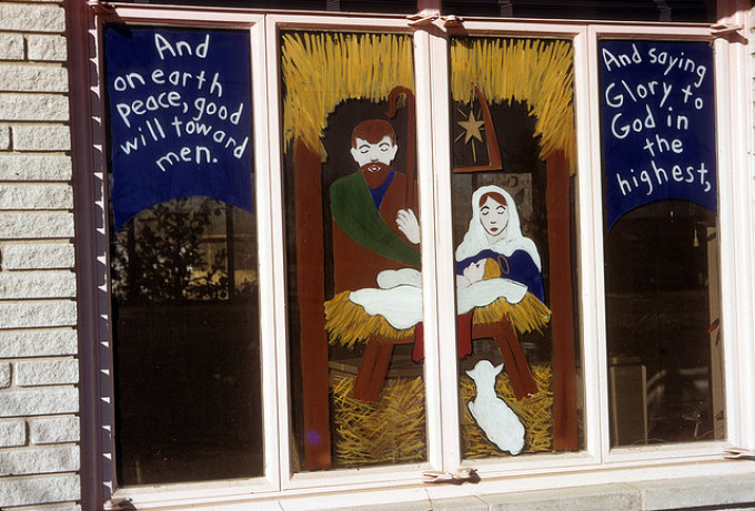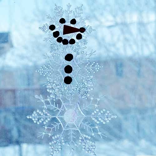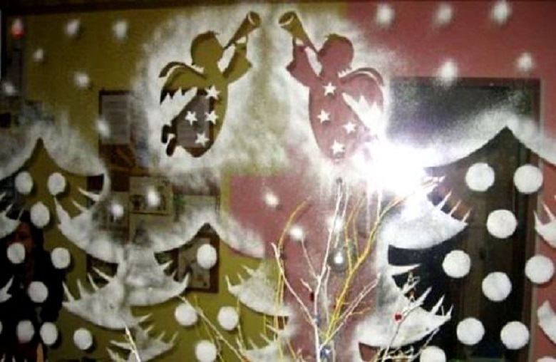 Например, создавая новогодний рисунок на окна с помощью вытынанок, его потом очень легко заменить на рисунки с рождественской тематикой. Одни картинки удаляем, а другие наклеиваем.