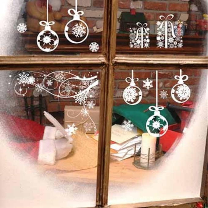 Нельзя ограничиваться только снежинками и гирляндами. Окна можно украсить игрушками, предназначенными для елки.