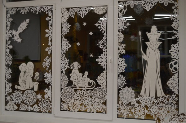 - Украшение на окна чаще всего делают из бумаги – это и бюджетно, и просто, и, кроме того, можно легко сменить одну идею на другую.