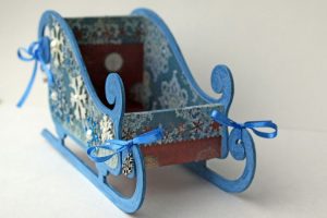 Для этого используется кисть или губка. Когда клей высохнет, сани покрываются акриловой краской. Изготавливается сидение – оно послужит скрепляющим верхние детали элементом.