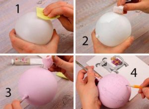 Надуйте три шара разных размеров. Если по планам снеговик в Новый год должен стоять на полу, шар сразу надо загрузить, к примеру, тяжелыми шайбочками или камнями, а потом надувать. Для подвесных игрушек ничего не надо делать. Обматываете аккуратно по кругу белыми нитками слой за слоем, промазывая каждый слой клеем ПВА. Шарик должен фактически исчезнуть под паутиной нитей. Просушиваете, затем берете в руки сухой шар, лопаете его иголкой, аккуратно ликвидируете остатки шара, в руках остается только клубок. Скрепляете клубки между собой нитками, украшаете блесками, пайетками. Из цветной бумаги сворачиваете нос и вырезаете глаза, приклеить все можно на двойной скотч.