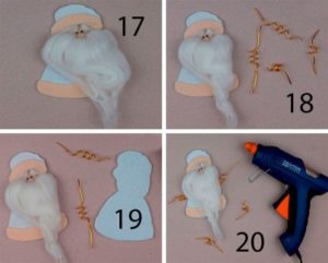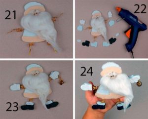 - Отдельно украшается верхушка — это шапочка. На вершину приклеивают шарик из ваты.