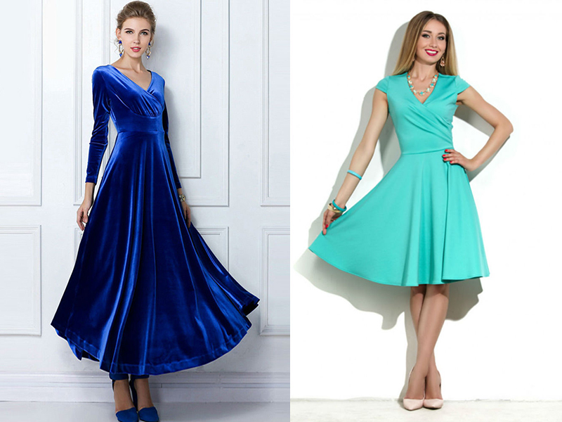 Лиф в платье, как правило, сильно облегающий, а плотно сидящая на талии юбка-солнце роскошными фалдами падает вниз, струясь и играя при движении. Длина юбки варьируется от мини до макси, независимо от исполнения изделие смотрится восхитительно.