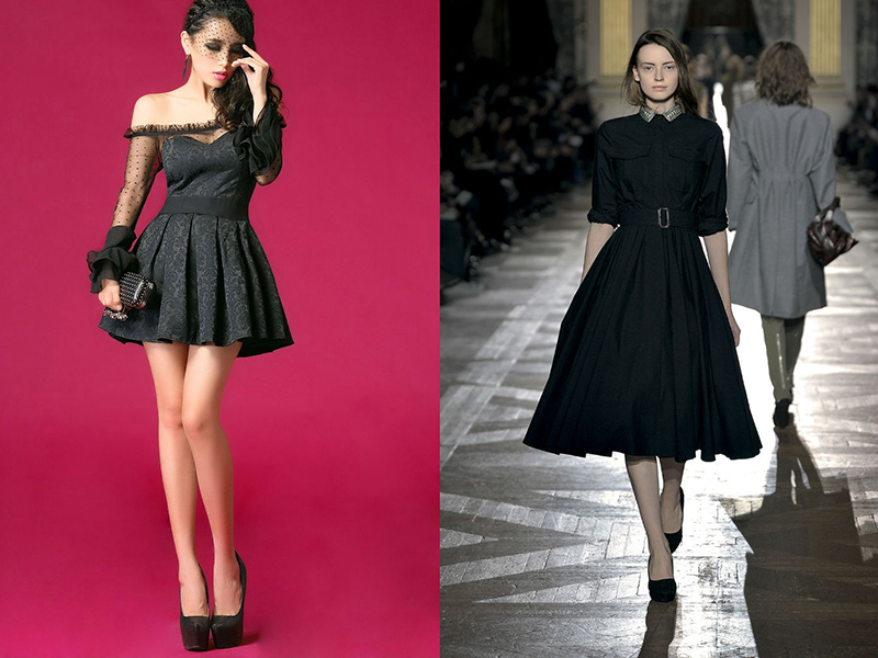 Короткое черное платье с юбкой солнце успешно заменяет платье-футляр. Оно достаточно сдержанное для официальных мероприятий. Если добавить к такому наряду яркие аксессуары, подобное платье станет хорошим выбором для торжественных случаев. В длинном черном платье такого фасона девушка смотрится необычайно элегантно.